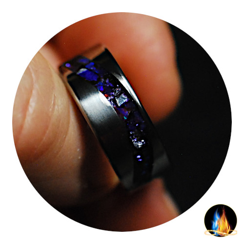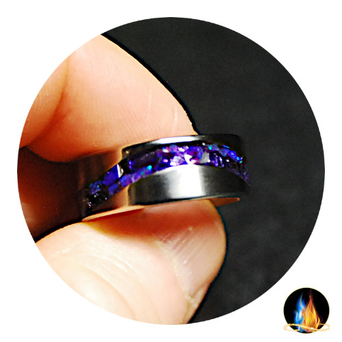 Beautiful 'S' Wave Titanium Ring inlaid with Indigo Opal and Purple Glass Shards on Comfort Band. The Opal Glass inlay is encased in acrylate for a high gloss, very durable waterproof finish for daily wear!