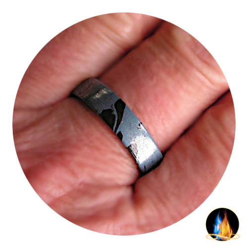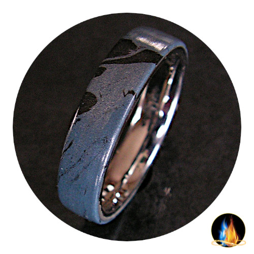 Beautiful Cobaltium Mokume Gane mounted on Medical Grade Stainless Steel Comfort Band. The M3 Metal Composite is polished for a high gloss finish. This M3 ring should NOT be immersed in water or chemicals frequently! Occasionally is fine.