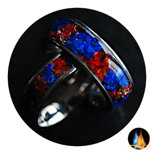 Beautiful "Flames" Titanium Ring inlaid with Orange Fire and Ice Blue Opal on Comfort Band. The Crushed Opal inlay is encased in acrylate for a high gloss, very durable waterproof finish for daily wear!