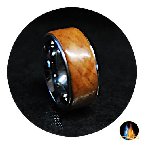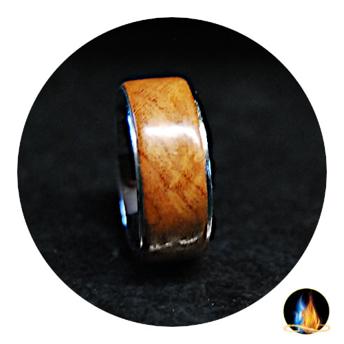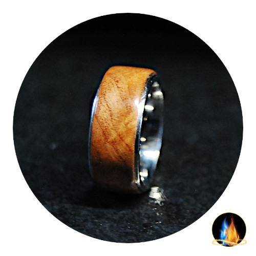Beautiful Madrona Burl Wood mounted on Medical Grade Stainless Steel Comfort Band. The Exotic Wood is encased in acrylate for a high gloss durable finish. This wood ring should NOT be immersed in water!
